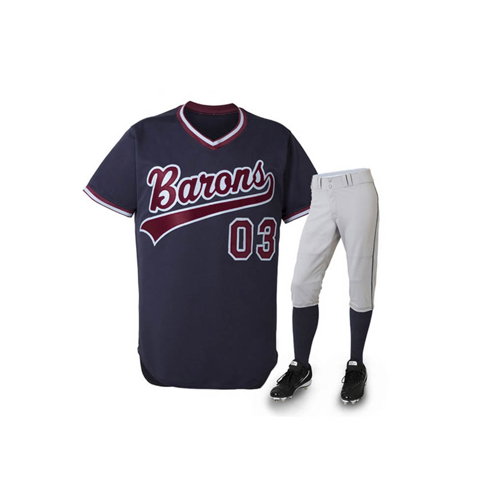 Step onto the field with a commanding presence in this Navy and Maroon uniform set. Combining a rich, dark jersey with sharp script lettering and clean grey pants, this uniform gives your team a cohesive, professional edge.
