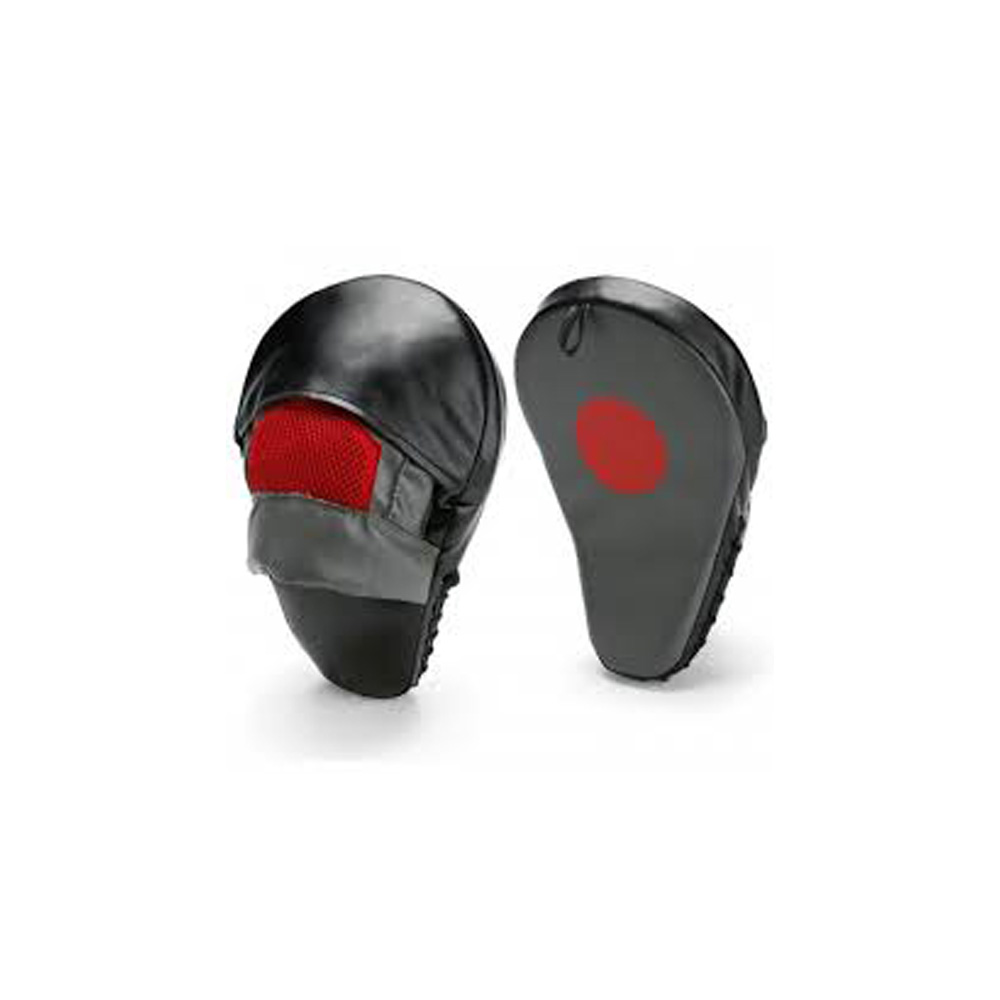 These sleek black and red precision pads are built for intensive training sessions where ventilation and grip are paramount. The compact, contoured shape is ideal for developing rapid combinations and improving pinpoint accuracy. A key feature is the ventilated red mesh panel over the back of the hand/fingers, which enhances airflow and reduces moisture buildup for the mitt holder. The striking surface features a high-contrast red circular target against a matte grey background for exceptional focus.