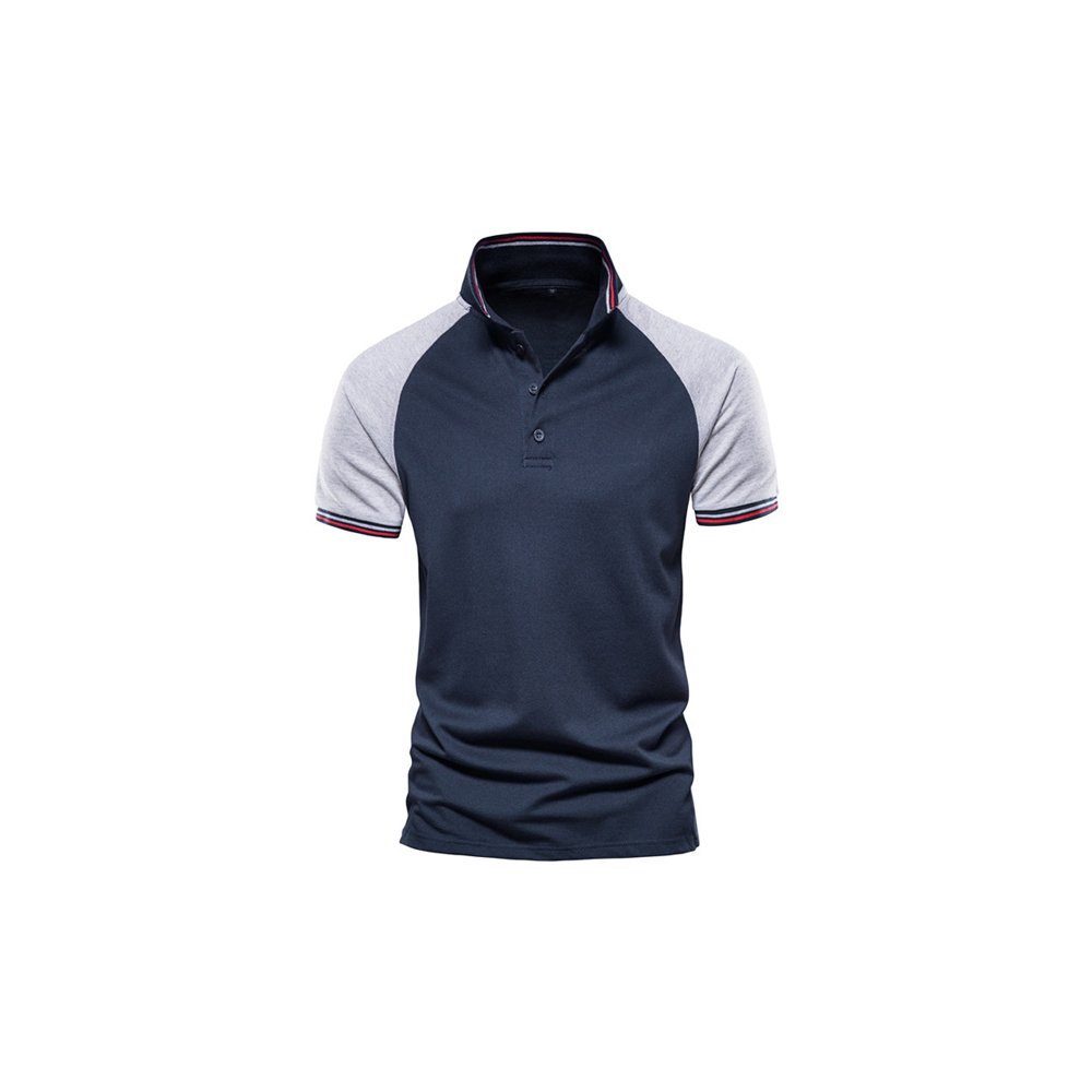 This polo features contrasting raglan sleeves in light gray, providing a distinctly athletic and comfortable fit across the shoulders. The body is a solid, versatile navy, accented by striped tipping on the sleeve cuffs and collar for an extra pop of retro sport detail. Perfect for a casual outing, a light activity, or pairing with jeans on the weekend.