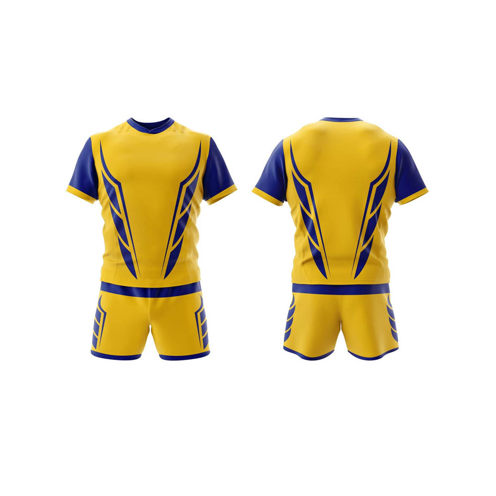 The matching yellow shorts feature a contrasting royal blue waistband and coordinating blue trim and side graphics, completing the unified, aggressive look.